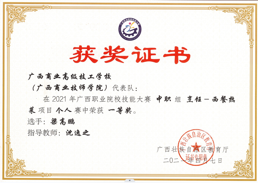 • 廣西職業院校技能大賽西餐熱菜 區級一等獎